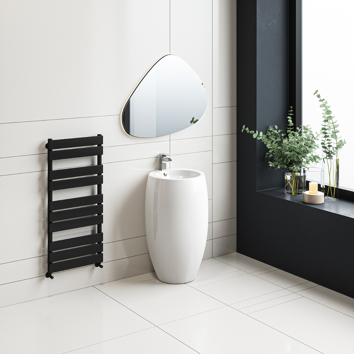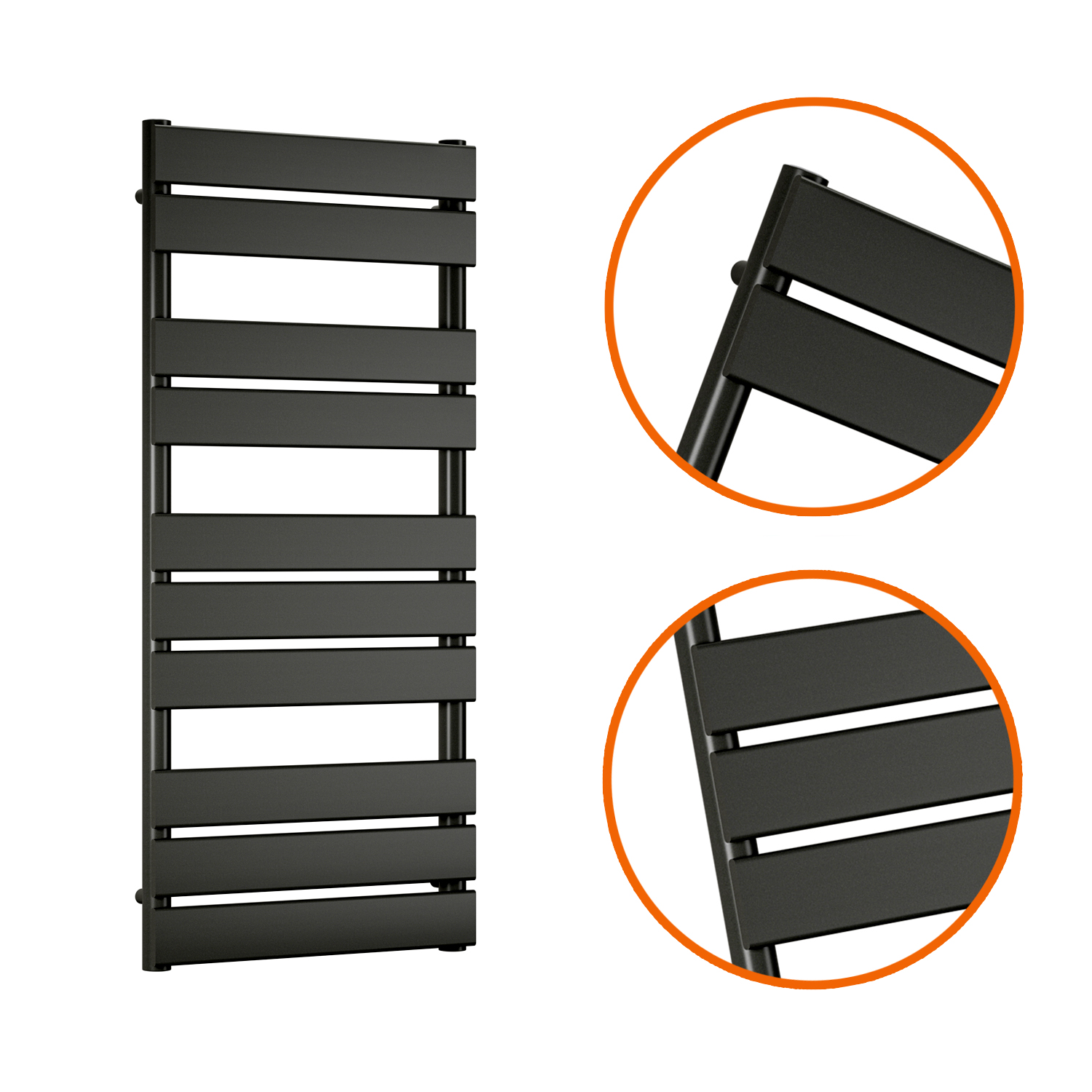This black towel rail has 10 oversized flat panel tubes which look fantastic and are sure to modernise the appearance of your bathroom.