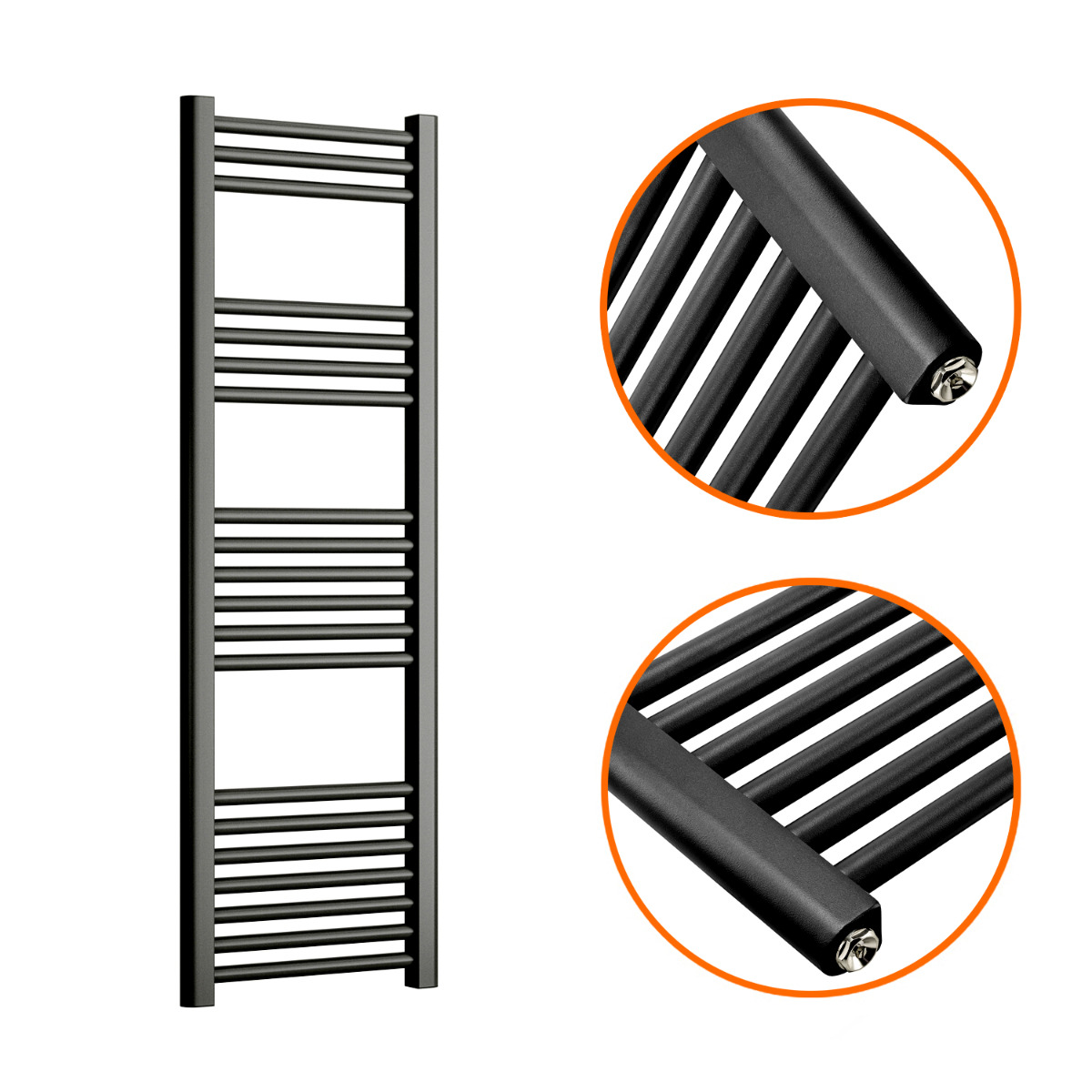 These 1200mm x 400mm black towel rails and an excellent way to enhance the appearance and warmth of your bathroom. The radiators are manufactured to the highest possible standards using premium quality mild steel which ensures reliability and they emit a fantastic heat output of 1074 BTUs.