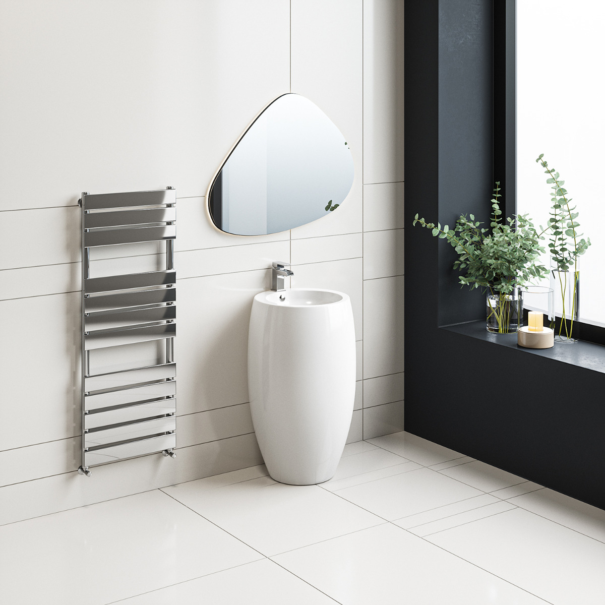 These 1200mm x 450mm chrome flat panel towel rails and an excellent way to enhance the appearance and warmth of your bathroom. The radiators are manufactured to the highest possible standards using premium quality mild steel which ensures reliability and they emit a fantastic heat output of 1136 BTUs.