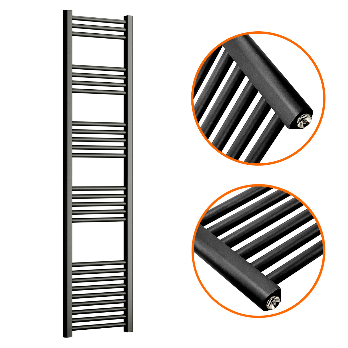 These 1600mm x 400mm black towel rails and an excellent way to enhance the appearance and warmth of your bathroom. The radiators are manufactured to the highest possible standards using premium quality mild steel which ensures reliability and they emit a fantastic heat output of 1410 BTUs.