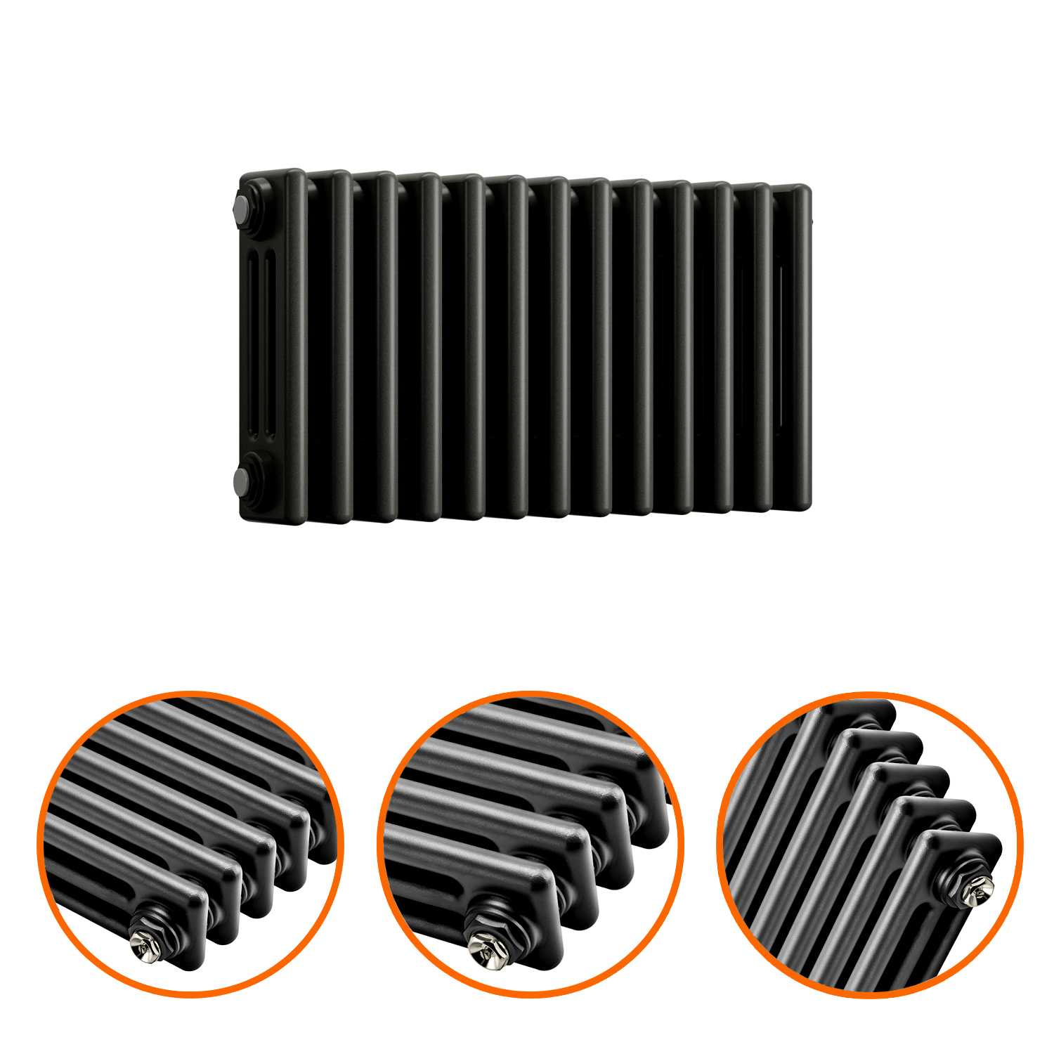 This column radiator is the three-column variant and ideal for heating up larger sized areas effectively. The radiators black textured finish compliments both period and modern décor perfectly.