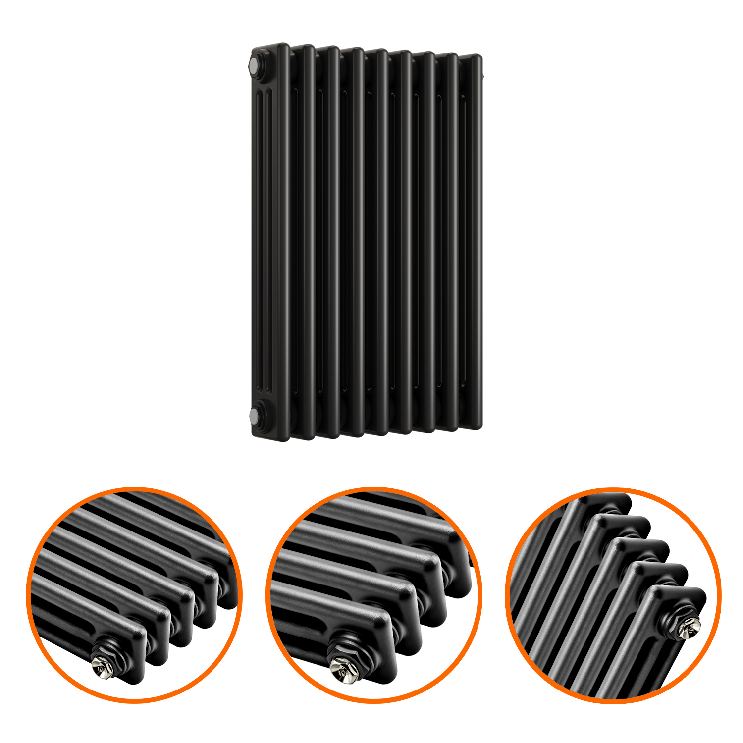 This column radiator is the three-column variant and ideal for heating up larger sized areas effectively. The radiators black textured finish compliments both period and modern décor perfectly.