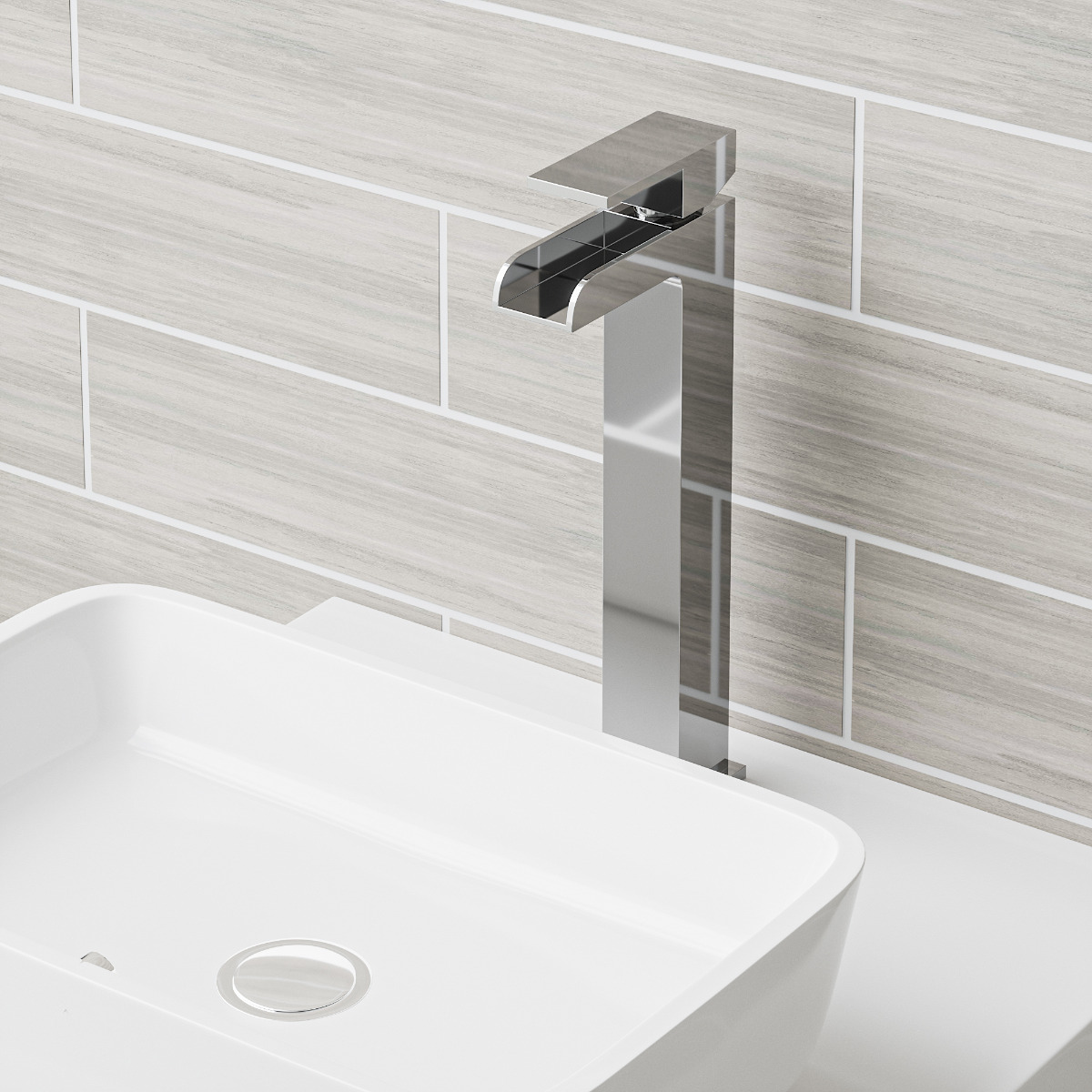 This tap is the perfect companion to modern looking counter top basin sinks. With it's high rise and beautiful waterfall effect, it's the perfect tap to complete a fashionable modern look.